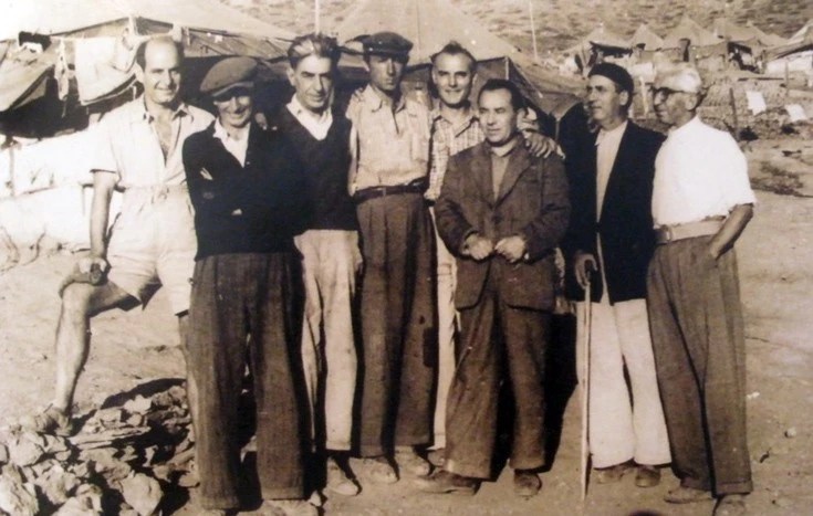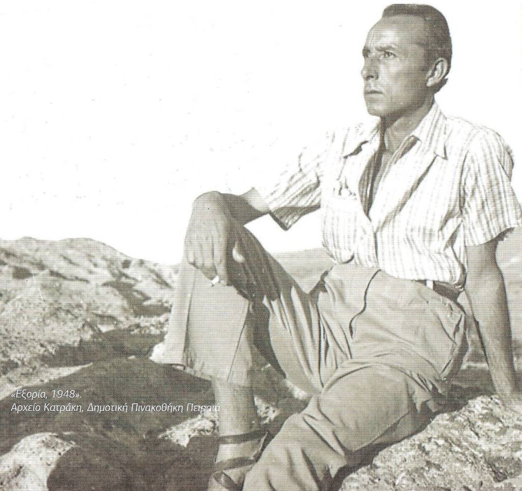 Εξόριστοι στη Μακρόνησο. Διακρίνονται από αριστερά: ο ηθοποιός Γ. Γιολδάσης, ο λογοτέχνης Μενέλαος Λουντέμης, ο ιστορικός Δημήτρης Φωτιάδης, ο Μάνος Κατράκης, ο ηθοποιός Τζαβαλάς Καρούσος, ο λογοτέχνης Νίκος Παπαπερικλής, ο Γιάννης Ιμβριώτης και ο ηθοποιός Κώστας Ματσακάς. Δεξιά: Ο Μάνος Κατράκης στη Μακρόνησο με τον ποιητή Γιάννη Ρίτσο.