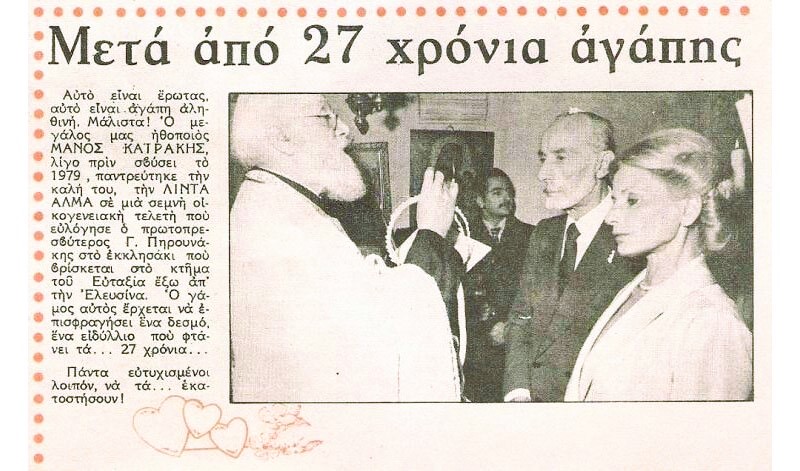 Δημοσίευμα για τον γάμο του με τη Λίντα Άλμα, στην Ελευσίνα, το 1979