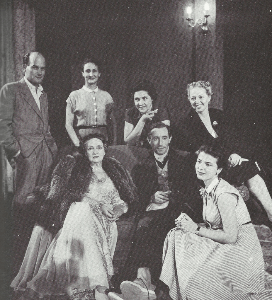 Οι συντελεστές της παράστασης «Η καλή κυρία» του Τσοντόρωφ στη σκηνή του θεάτρου «Κυβέλη» (1953): Ο σκηνοθέτης Αλέξης Σολωμός και ο θίασος της παράστασης, η Κυβέλη με τις δύο κόρες της, Μιράντα και Ρίτα Μυράτ, η Αλίκη Γεωργούλη, η Έλλη Ξανθάκη και ο Μάνος Κατράκης