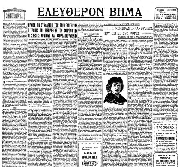 * Κείμενο – ιστορικό σημείωμα του Άντονυ Πράγκα, που έφερε τον τίτλο «Ρέμπραντ, ο άνθρωπος που έζησε δύο φορές» και είχε δημοσιευτεί στην εφημερίδα «Ελεύθερον Βήμα», στις 16 Φεβρουαρίου 1928.
