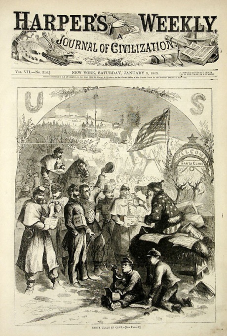 Η ιστορία αυτή εικονογραφήθηκε το 1863, κατά τη διάρκεια του αμερικανικού Εμφυλίου, από τον χιουμοριστικό πολιτικό καρτουνίστα Τόμας Ναστ (Thomas Nast, 1840-1902), γερμανικής καταγωγής, ο οποίος εργαζόταν στο Harper’s Weekly, το μεγαλύτερο εικονογραφημένο περιοδικό της εποχής και του είχε ανατεθεί ν’ απεικονίζει με αλληγορικές εικόνες τα δρώμενα του πολέμου. Μία από αυτές ήταν «Ο Άγιος Βασίλης στο στρατόπεδο», όπου παρουσιάστηκε για πρώτη φορά ο Άγιος με τα χαρακτηριστικά ενός ευτραφούς, ροδαλού άνδρα, στολισμένου από άστρα, ο οποίος μοίραζε δώρα σε ένα στρατόπεδο των Βορείων.