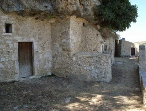 Στον εξωτερικό χώρο του σπηλαίου υπάρχει περίβολος με κελιά που διατηρούνται σε άριστη κατάσταση. Το μοναστήρι χτίστηκε κατά το Βυζάντιο, ενώ αργότερα στην Ενετοκρατία, υπήρξε η έδρα της οικογένειας των επαναστατών Χορτάτζηδων. Στο λιθόστρωτο καλντερίμι που οδηγεί στη μονή βλέπουμε κρήνες με τρεχούμενο νερό, ενώ υπάρχουν πολλά πλατάνια που προσφέρουν τη σκιά τους. Ένα από αυτά υπάρχει από την περίοδο της Τουρκοκρατίας.