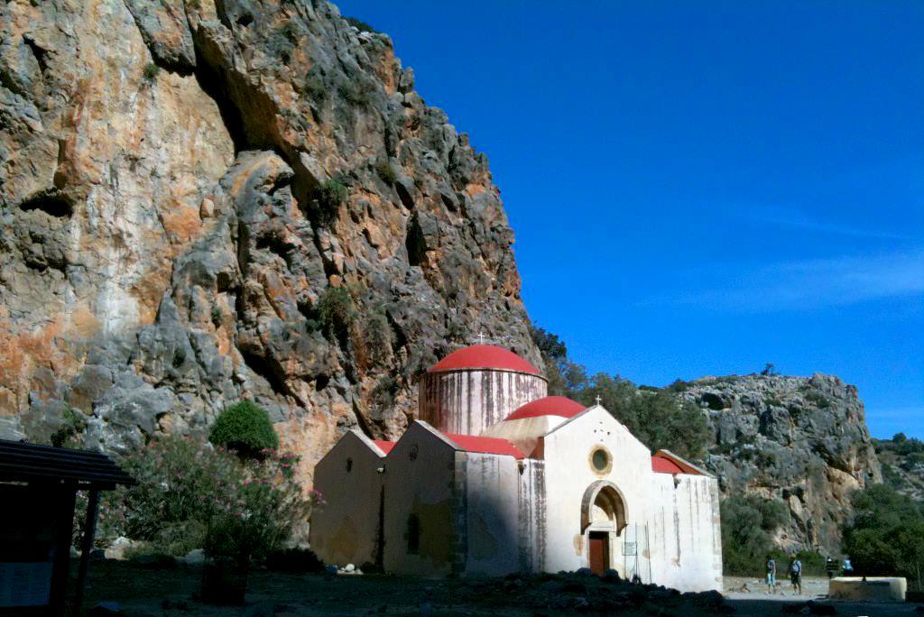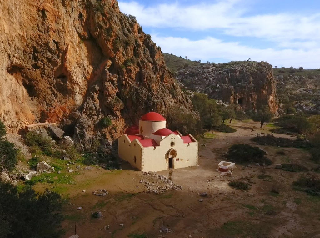 Κατ’ αρχάς, ήταν ένα μικρό εκκλησάκι σε μια μικρή σπηλιά μέσα στο βράχο, αλλά καθώς περνούσαν τα χρόνια και μεγάλωνε ο αριθμός των ασκητών χρειαζόταν μεγαλύτερη εκκλησιά γι’ αυτό και την μεγάλωσαν. Για τρίτη και τελευταία φορά ανακαινίστηκε -ή μεγάλωσε- κατά τον 14ο ή 15ο αιώνα και έτσι διατηρείται μέχρι σήμερα. Είναι αρίστης τεχνικής αρχιτεκτονικής και είχε τοιχογραφηθεί, αλλά λόγω του ότι βρίσκεται κοντά στην θάλασσα οι τοιχογραφίες καταστράφηκαν. Έξω από την εκκλησία υπάρχει ένα πηγάδι, από το οποίο προμηθεύονταν το νερό τους οι ασκητές καθ’ ότι δεν υπάρχει εκεί κοντά καμία πηγή. Νότια από την εκκλησία, πάνω σ’ ένα μικρό ύψωμα, βρέθηκε συλημένος κυκλικός θολωτός μινωικός τάφος, που δείχνει την ανθρώπινη παρουσία από την Μινωική εποχή.