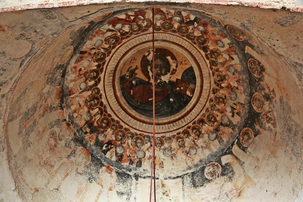 Στην αρχική διακόσμηση, δηλαδή στα τέλη του 9ου αιώνα, φαίνεται να ανήκει η παράσταση της Σταύρωσης. Στον 11ο αιώνα ανήκουν οι παραστάσεις της Θυσίας του Αβραάμ, του αγίου Παντελεήμονος, των αγίων Ανδρονίκου και Αθανασίας, όπως και κάποιες άλλες πολύ φθαρμένες παραστάσεις. Στον 12ο αιώνα ανήκουν η μορφή του Αβραάμ, η ένθρονη Θεοτόκος, ο ιεράρχης αριστερά από τον Αβραάμ, τρεις παραστάσεις έφιππου αγίου Γεωργίου, η αποτοιχισμένη τοιχογραφία της όρθιας δεομένης Θεοτόκου δίπλα σε άγιο, οι άγιοι Διομήδης(;), Ανδρόνικος και Δημήτριος. Στον 13ο αιώνα, τέλος, ανήκει η Σταύρωση, μία παράσταση της Προδοσίας, καθώς και η αποτοιχισμένη τοιχογραφία του αγίου Δημητρίου.