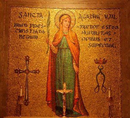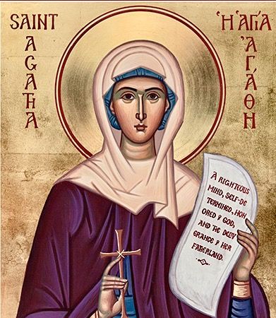 Στολιζέσθω σήμερον, ἡ Ἐκκλησία, πορφυρίδα ἔνδοξον, καταβαφεῖσαν ἐξ ἁγνῶν, ῥύθρων Ἀγάθης τῆς Μάρτυρος· Χαῖρε, βοῶσα, Κατάνης τό καύχημα.