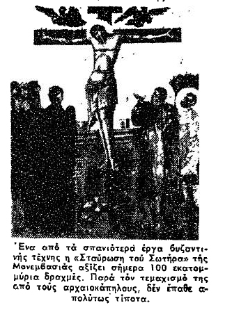 Ἐν τῷ Ναῷ τούτῳ τεθησαύρισται ἡ Βυζαντινὴ εὐμεγέθης εἰκὼν τῆς Σταυρώσεως, πρωτοτύπως ἔχουσα τὸν Ἐσταυρωμένον τεταμένας εὐθείας ἔχοντα τὰς ἀχράντους Αὐτοῦ χεῖρας καὶ ἔνθεν καὶ ἡ πρωτοτυπία του, παλαιολογείου εποχῆς, οὐχὶ ἀπίθανον νὰ εἶναι δῶρον τοῦ εἰρημένου κλεινοῦ Αὐτοκράτορος Ἀνδρονίκου. Αὕτη, ἐπὶ τῶν ἡμερῶν τῆς ἐκεῖ διακονίας ἡμῶν, Ἀρχιερατεύοντος τοῦ Μητροπολίτου κυροῦ Ἱεροθέου, ἐκλάπη καὶ εὐτυχῶς εὑρίσκεται εἰς τὸ Βυζαντινὸν Μουσεῖον συντηρηθεῖσα, ὡς ἐπὶ τῶν ἡμερῶν του ἐκλάπη καὶ ἡ ἐφέστιος τῶν Ἁγίων Τεσσαράκοντα Μαρτύρων τῆς ἰδίας ἐποχῆς, τῆς ὁμωνύμου ἐν Σπάρτῃ Μονῆς. Ἡμεῖς συνηγοροῦμεν καὶ ἐντεῦθεν τῷ πανδήμῳ αἰτήματι τῶν συντοπιτῶν ἡμῶν Μονεμβασιωτῶν ὑπὲρ τῆς ἐπιστροφῆς τῆς μεγαλωνύμου ἱερᾶς εἰκόνος τῆς Σταυρώσεως εἰς τὴν οἰκείαν θέσιν αὐτῆς, τὸ καύχημα τῆς Μονεμβασίας. Ἐπὶ τοῦ τέμπλου δὲ εὕρηνται σήμερον αἱ τέσσαρες δεσποτικαὶ εἰκόνες εἰς μέγεθος κανονικῶν ἀνθρωπίνων διαστάσεων ὀρθίας στάσεως, Τοῦ Ἑλκομένου, τῆς Θεοτόκου, τῆς Γεννήσεως τοῦ Χριστοῦ καὶ τοῦ θείου Προδρόμου, ὁμοίας τέχνης. Τοῦ Ἑλκομένου, ἔχομεν τὴν πληροφορίαν ὅτι ἐγράφη εἰς τοὺς Κορφοὺς τυγχάνουσα ἀφιέρωμα τοῦ Λικινίου.
