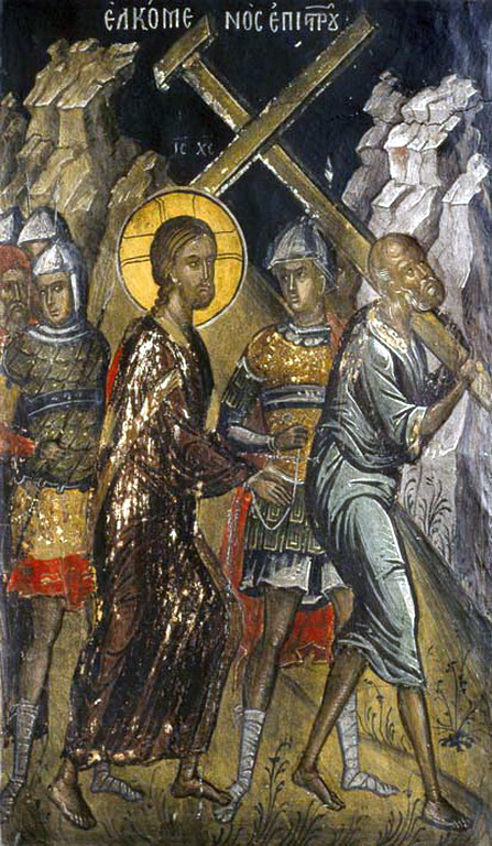 Εμπρός από τον Κύριο εικονίζεται ένας δύσμορφος στρατιώτης και ο Σίμωνας ο Κυρηναίος. Ο στρατιώτης προσφέρει στο Χριστό μας ένα αγγείο με νερό ή κρασί για να πιει, ενώ ο Σίμωνας σηκώνει στους ώμους του το Σταυρό του μαρτυρίου. Πίσω από τον Κύριο ακολουθεί η σπείρα των στρατιωτών με αποκρουστικές όψεις. Φορούν δερμάτινους πλουμιστούς θώρακες, κοντούς στρατιωτικούς χιτωνίσκους και κρατούν στα χέρια τους τριγωνικές ασπίδες και δόρατα.