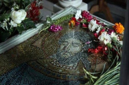 με τα λείψανα των Αγίων. Φέρει ανάγλυφη εικόνα της Παναγίας