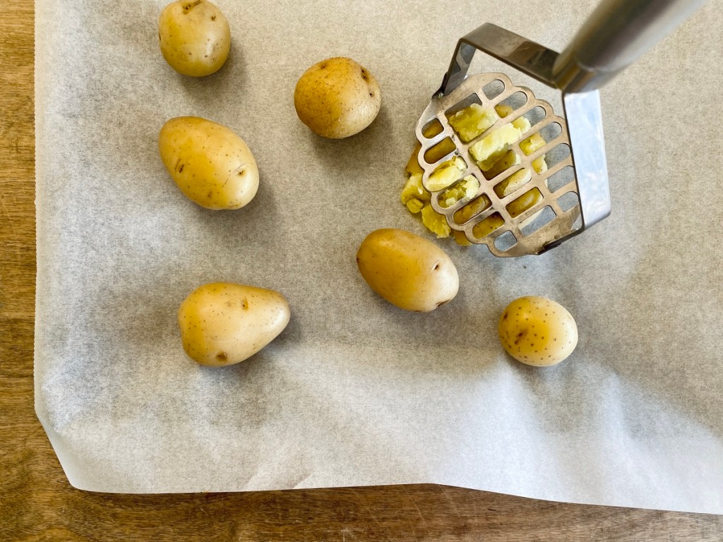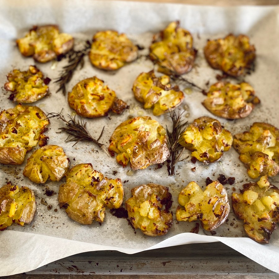Πλένουμε καλά τις πατάτες και τις βάζουμε σε μεγάλη κατσαρόλα. Τις καλύπτουμε με κρύο νερό, προσθέτουμε λίγο αλάτι και βράζουμε για 20-30 λεπτά σε μέτρια φωτιά, μέχρι να μαλακώσουν. Αν οι πατάτες είναι δυσανάλογες σε μέγεθος, τις μικρές τις βγάζουμε όταν «γίνουν» και τις μεγαλύτερες τις αφήνουμε λίγο παραπάνω χρόνο. Τις στραγγίζουμε και τις αφήνουμε να στεγνώσουν καλά (το στέγνωμα είναι σημαντικό για να βγουν μετά ωραίες και τραγανές). Προθερμαίνουμε τον φούρνο στους 190 βαθμούς, πάνω – κάτω, στις αντιστάσεις. Σε μικρό κατσαρολάκι βάζουμε το βούτυρο και το σκόρδο σε χαμηλή φωτιά μέχρι να λιώσει το βούτυρο και να αρωματιστεί από το σκόρδο. Αποσύρουμε από τη φωτιά και ανακατεύουμε μέσα το ελαιόλαδο. Στρώνουμε λαδόκολλα σε δύο ή τρεις μεγάλες λαμαρίνες. Βάζουμε τις πατατούλες σε απόσταση μεταξύ τους και τις πατάμε απαλά και προσεκτικά με το εργαλείο του πουρέ ή με μεγάλο πιρούνι. Καλό είναι να υπάρχει αρκετός χώρος μεταξύ τους και να μην ακουμπάει η μία την άλλη, ώστε να ψηθούν ομοιόμορφα. Αφαιρούμε το σκόρδο από το μείγμα με το λιωμένο βούτυρο και περιχύνουμε με λίγο από αυτό τις πατάτες. Προσθέτουμε αλάτι και πιπέρι και τοποθετούμε ανάμεσα στις πατάτες τις φουντίτσες από το δεντρολίβανο. Ψήνουμε στον φούρνο για 30-40 λεπτά περίπου μέχρι οι πατάτες μας να ροδίσουν όμορφα και να γίνουν τραγανές εξωτερικά. Καλή επιτυχία και καλή όρεξη!