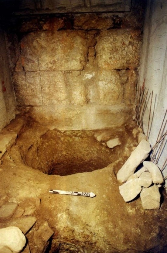 Αριστερά: Το ανάλημμα της αρχαίας οδού Τριπόδων στον αύλειο χώρο. Διακρίνονται υστερορωμαϊκοί – παλαιοχριστιανικοί αγωγοί. Δεξιά: Η επιγραφή που βρέθηκε εντοιχισμένη σε βυζαντινή φάση του αναλημματικού τοίχου της οδού Τριπόδων
