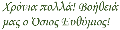 Τὰς φροντίδας τοῦ βίου ἀπαρνησάμενος, καὶ Ἀγγέλων τὸν βίον ἀναλαβόμενος, ἐγκρατείᾳ τὴν ψυχὴν κατελάμπρυνας· καὶ θαυμάτων ἐκ Θεοῦ, χάριν ἐδέξω δαψιλῶς, Εὐθύμιε θεοφόρε, ὑπὲρ ἡμῶν ἱκετεύων, τῶν εὐσεβῶς εὐφημούντων σε.