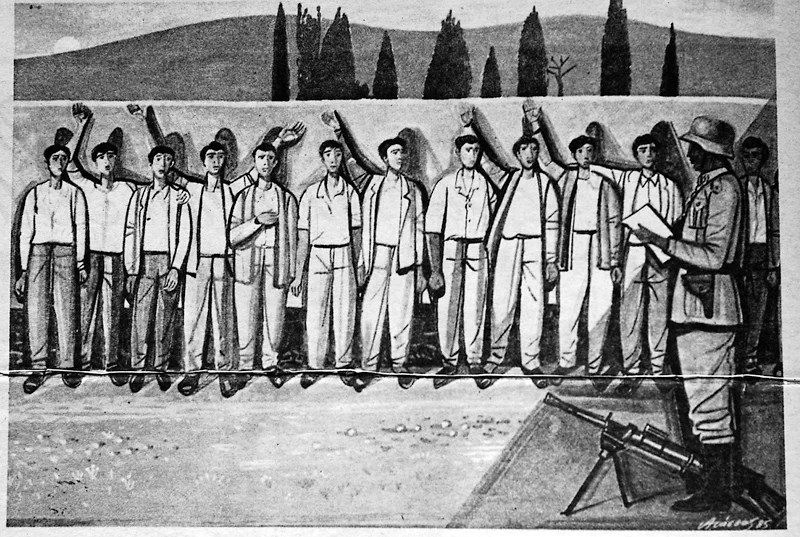 Στα καρέ βλέπουμε τους Έλληνες πολιτικούς κρατουμένους να οδηγούνται ανά δύο στο σκοπευτήριο. Σε άλλο καρέ είναι πλέον παρατεταγμένοι στον «Τοίχο της Καισαριανής» περιμένοντας ηρωικά τις ριπές από τα πολυβόλα. Οι Έλληνες, στην πλειοψηφία τους κομμουνιστές και μέλη του ΕΑΜ, έχουν παροιμιώδη ψυχραιμία παρότι γνωρίζουν πως διανύουν τα τελευταία δραματικά βήματα της ζωής τους και δείχνουν καλοντυμένοι και ήρεμοι. Οι περισσότεροι είχαν παραδοθεί στους Γερμανούς από το καθεστώς Mεταξά.