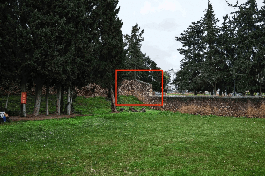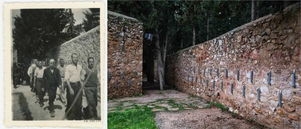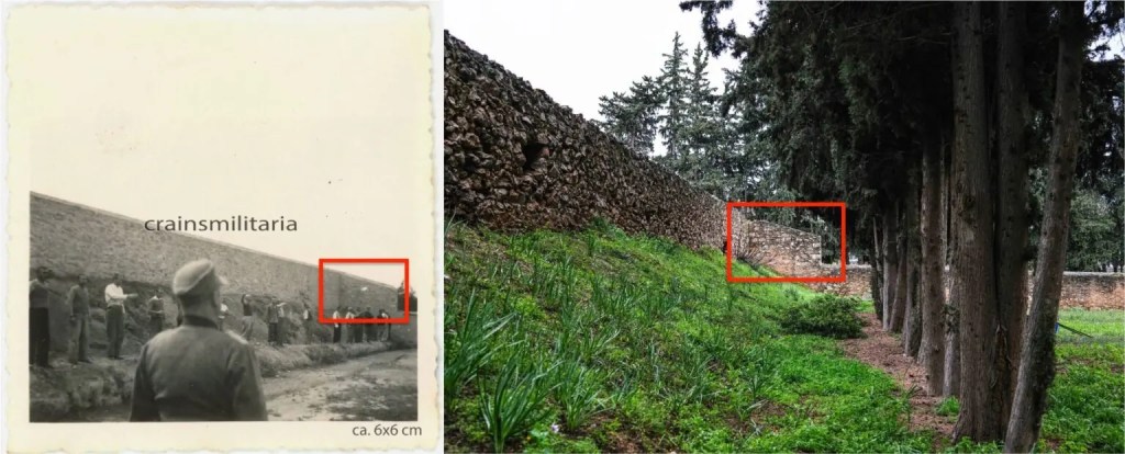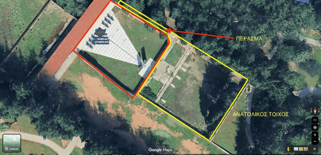 Η διάταξη του χώρου είναι ορατή στο Google Maps εδώ και επισημαίνεται στο παρακάτω στιγμιότυπο οθόνης (το δυτικό τμήμα είναι περικυκλωμένο με κόκκινο και το ανατολικό με κίτρινο). Ο τοίχος αποτυπώνεται στις φωτογραφίες είναι ο ανατολικός τοίχος, πίσω από τα κυπαρίσσια και το σημερινό μνημείο. Έτσι, η γωνία του ανατολικού τοίχου αντιστοιχεί ακριβώς σε εκείνη που διακρίνεται στις αρχειακές φωτογραφίες, η δε δεύτερη αρχειακή φωτογραφία έχει ληφθεί στην έξοδο του διαδρόμου που οδηγεί προς το δεύτερο τμήμα του χώρου, όπως δείχνει η σύγκριση των παρακάτω εικόνων::