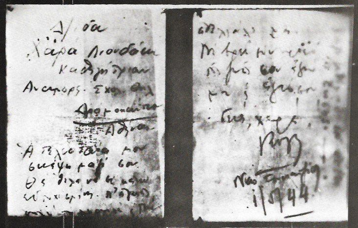 «Καλύτερα να πεθαίνη κανείς στον αγώνα για την λευτεριά, παρά να ζη σκλάβος, N. Μαριακάκης Γεωπόνος Χανιά Κρήτης. 1-5-44. Όποιος το βρει να μην το καταστρέψη».