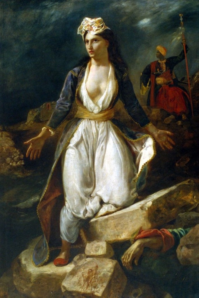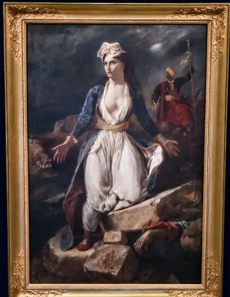 Το αριστούργημα του Ευγένιου Ντελακρουά «Η Ελλάδα στα ερείπια του Μεσολογγίου» είναι εμπνευσμένο από την ηρωική αντίσταση και την έξοδο των Ελλήνων κατά την τρίτη πολιορκία του Μεσολογγίου. Εικονίζει την Ελλάδα με τη μορφή νεαρής γυναίκας που στέκει πάνω στα ερείπια του Μεσολογγίου που έχουν καταπλακώσει έναν αγωνιστή. Φοράει παραδοσιακή ελληνική φορεσιά, ξεκούμπωτη στο στήθος και έχει τα χέρια ανοικτά σε στάση απόγνωσης μπροστά στην ανείπωτη θυσία των ηρωικών υπερασπιστών της πόλης, ενώ το όμορφο πρόσωπό της είναι κατά τα τρία τέταρτα στραμμένο προς τα αριστερά.