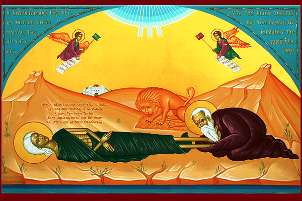 Πώς όμως να τη θάψει ο γέρων Ζωσιμάς; Πού και πώς να σκάψει σε εκείνη την έρημο, χωρίς να έχει εργαλεία; Νάσου ένα μεγάλο λιοντάρι εμφανίστηκε. Και σαν άνθρωπος έσκαψε με τα νύχια του και άνοιξε έναν λάκκο και έθαψε την Αγία. Και την παρουσιάζει τώρα η Εκκλησία μας την ημέρα αυτή και λέει: «Πόσο αμαρτωλή είσαι γυναίκα; Πόσο αμαρτωλός είσαι άνδρα; Υπάρχει σωτηρία! Μετανόησε όπως η γυναίκα αυτή και προχώρησε μετά να κάνεις σεπτά πάθη και να κάνεις Αγία Ανάσταση…».