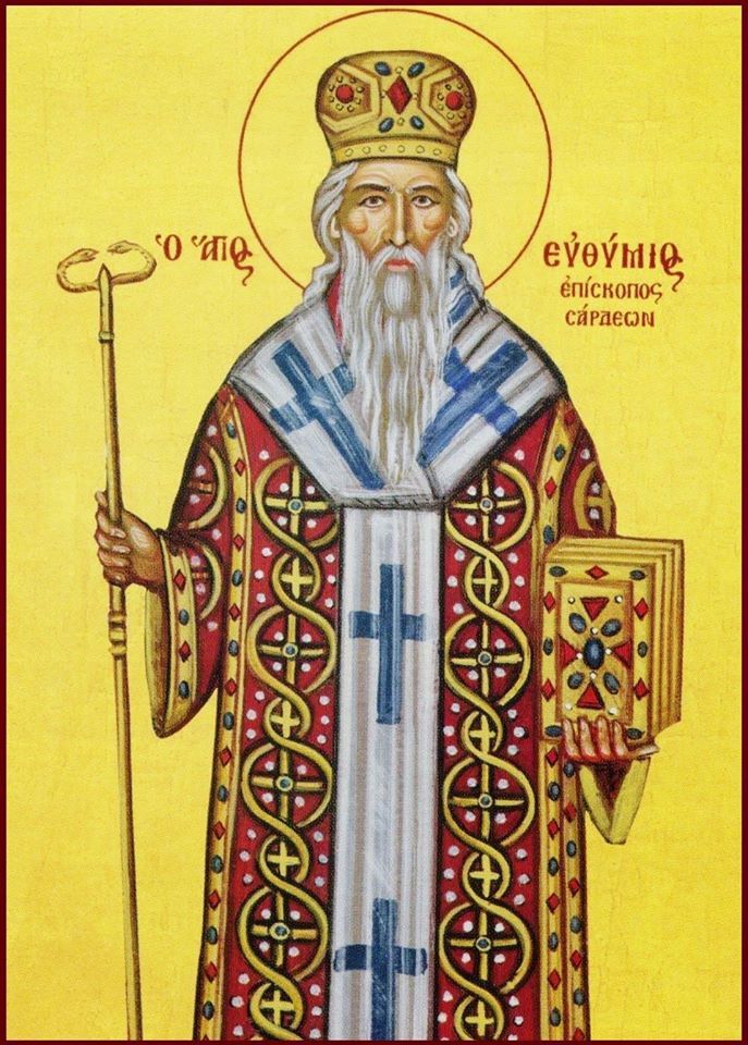 Ο άγιος Ευθύμιος γεννήθηκε το 754 στην Ουζάρα της Λυκαονίας. Σε νεαρή ηλικία ταξίδεψε στην Αλεξάνδρεια, όπου και σπούδασε. Αφού επέστρεψε στην ιδιαίτερη πατρίδα του, ακολούθησε τον μοναχικό βίο. Διετέλεσε Μητροπολίτης Σάρδεων και διακρίθηκε στη διάρκεια της Εικονομαχίας, ως ένθερμος οπαδός της εικονόφιλης παράταξης. Εκοιμήθη στις 26 Δεκεμβρίου 831, εξόριστος στο νησί του Αγίου Ανδρέα στην Προποντίδα.