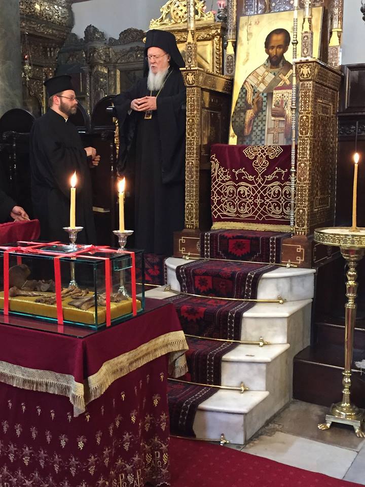 Στον σολέα του Πατριαρχικού Ναού τίθενται προς προσκύνησιν υπό των πιστών τα ιερά λείψανα του μεγάλου ιεράρχου της Κωνσταντινουπόλεως, τα οποία, μαζί με τα λείψανα του Αγίου Γρηγορίου του Θεολόγου, επέστρεψαν στην Πόλη από τη Ρώμη, στις 27 Νοεμβρίου 2004, χάριν στις ενέργειες του διαδόχου των αγίων ιεραρχών σημερινού Οικουμενικού Πατριάρχου Βαρθολομαίου.
