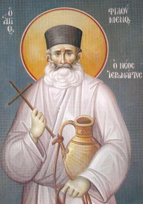 Ο Άγιος Φιλούμενος, κατά κόσμον Σοφοκλής Χασάπης, γεννήθηκε στη Λευκωσία στις 15 Οκτωβρίου 1913. Γονείς του ήταν οι ευσεβείς χριστιανοί Γεώργιος και Μαγδαληνή. Ήταν δίδυμος αδελφός με τον π. Ελπίδιο, κατά κόσμον Αλέξανδρο, και από μικροί ξεχώριχαν για την αγάπη που είχαν προς τον Θεό και γι’ αυτό από πολύ νωρίς άναψε μέσα τους η επιθυμία για τη μοναχική ζωή. Το 1927, σε ηλικία μόλις 14 ετών αναχώρησαν και οι δυο για την Ιερά Μονή Σταυροβουνίου, αφού πήραν την ευχή του πνευματικού τους, αλλά και των ευλαβών γονέων τους. Εκεί έμειναν 6 περίπου χρόνια, όταν ο Έξαρχος του Παναγίου Τάφου τους πήρε για να φοιτήσουν στο Γυμνάσιο του Πατριαρχείου στα Ιεροσόλυμα, όπου βρέθηκαν το 1934, μαθητές στη Σχολή της Αγίας Σιών.