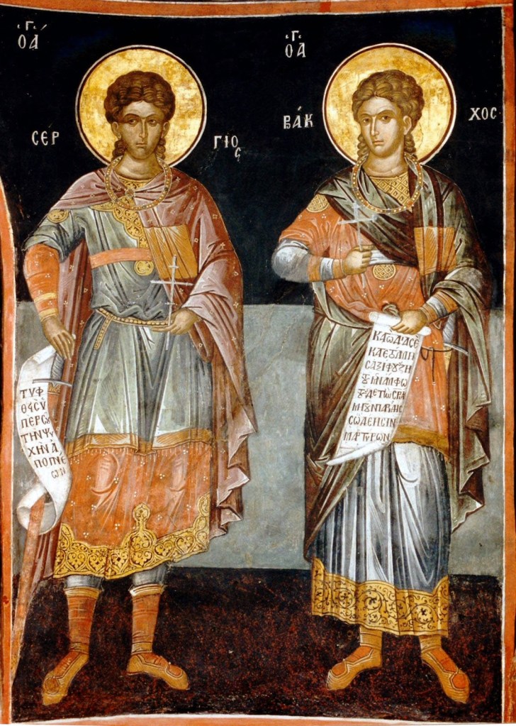 Οι Άγιοι Σέργιος και Βάκχος υπηρετούσαν στις στρατιωτικές τάξεις του αυτοκράτορα Μαξιμιανού. Τους διέκρινε μεγάλη ανδρεία στα πεδία των μαχών, αλλά και σωφροσύνη στην καθημερινή τους ζωή. Γι’ αυτό και ο αυτοκράτορας τους απένειμε τα αξιώματα του πριμικηρίου της σχολής των Kεντηλίων και του σεκουνδουκηρίου, αντίστοιχα. Όταν έμαθε ότι οι δύο επίλεκτοι στρατιώτες του ήταν χριστιανοί, δεν ήθελε με κανένα τρόπο να το πιστέψει.