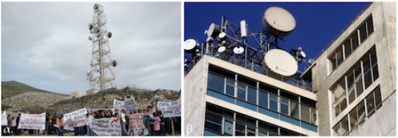 α. Η Ιερά Μονή Προφ. Ηλία Σαντορίνης μέσα σε ένα δάσος κεραιών β. Γιγαντιαίος πυλώνας της ΕΡΤ σε άμεση επαφή με το καμπαναριό της Μονής.. (πηγή: thesvitis.blogspot.com/p/blog-page_3774 )